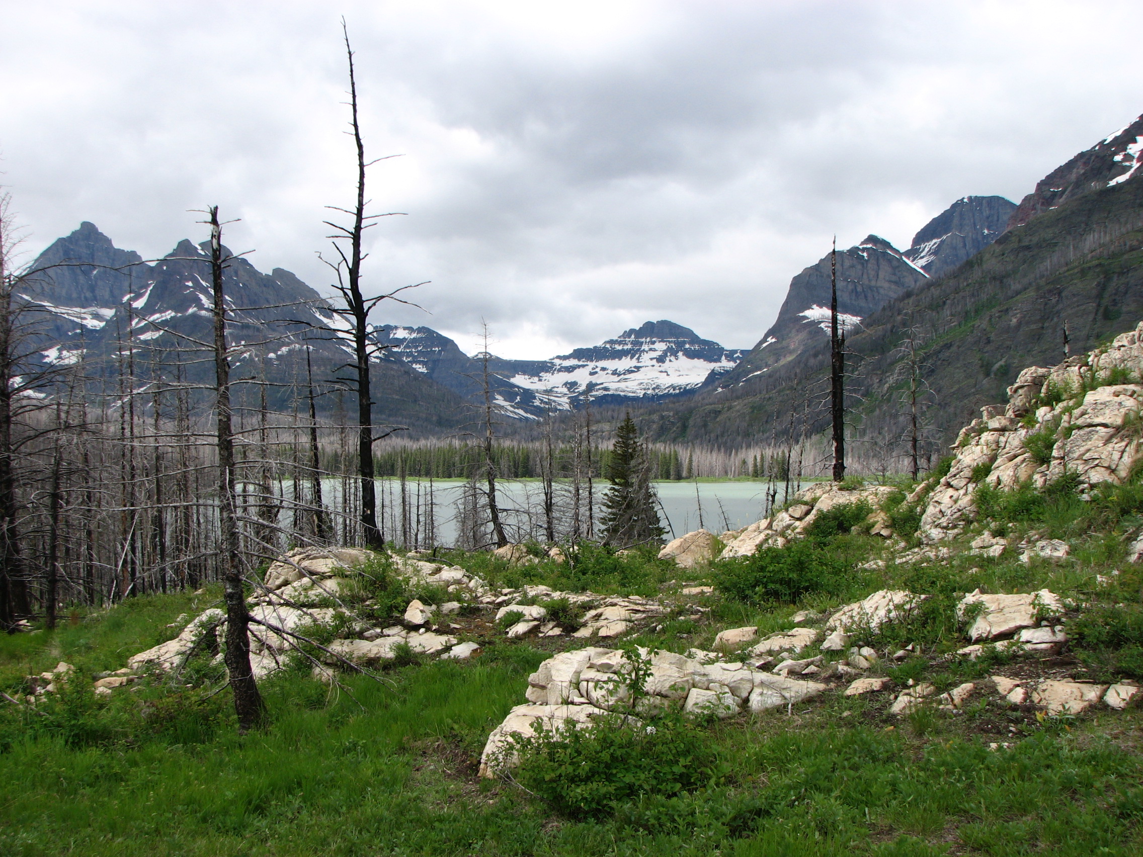 This hike was prettier than the last, through lush meadows bursting with wildflowers set against a backdrop of dramatic be-glaciered mountains. A fire had gutted the forest sometime recently, so rising out of the meadows are the skeletons of t