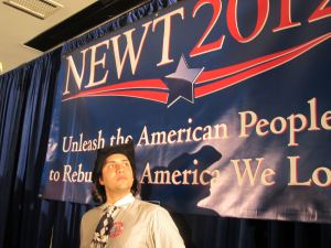 Despite the elaborate back-story Sally and I had concocted, fitting in at Newt’s party was actually pretty easy.  Like Newt supporters, we loathe Mitt Romney.  I mean, no one can stand the guy.  We’re also disappointed in President Obama and the direction this country is headed, though we’d part ways on the specifics.   And what I like most about Newt is that we really do need big ideas to get this country going.  The political discourse today is stale and dishonest, with all politicians talking up an America that no longer exists, if it ever did.