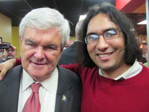 After taking a few pics outside with the Newtmobile, we chatted up his state director, Adam Waldeck, who seemed relieved to speak with people his own age instead of the old crazies that make up so much of Newt’s base.   He told us the victory party would be packed.  ”I’d get there by 8pm,” he said earnestly, noting that the campaign had already approved 260 press credentials.