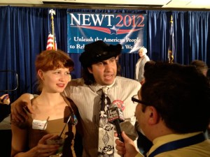 GQ revisited Sally’s favorite topic, open marriage, in an incredulous article about Newt’s swinging hipster supporters. Marin, the author, found out about our prank a day after publishing her piece, and was very cool about it. After all, she compared me to Johnny Depp on a night when I was going out of my way to look Republican (My style has long been validated by the Pirates of the Carribean franchise. This is a tale of Captain Jack Sparrow.)