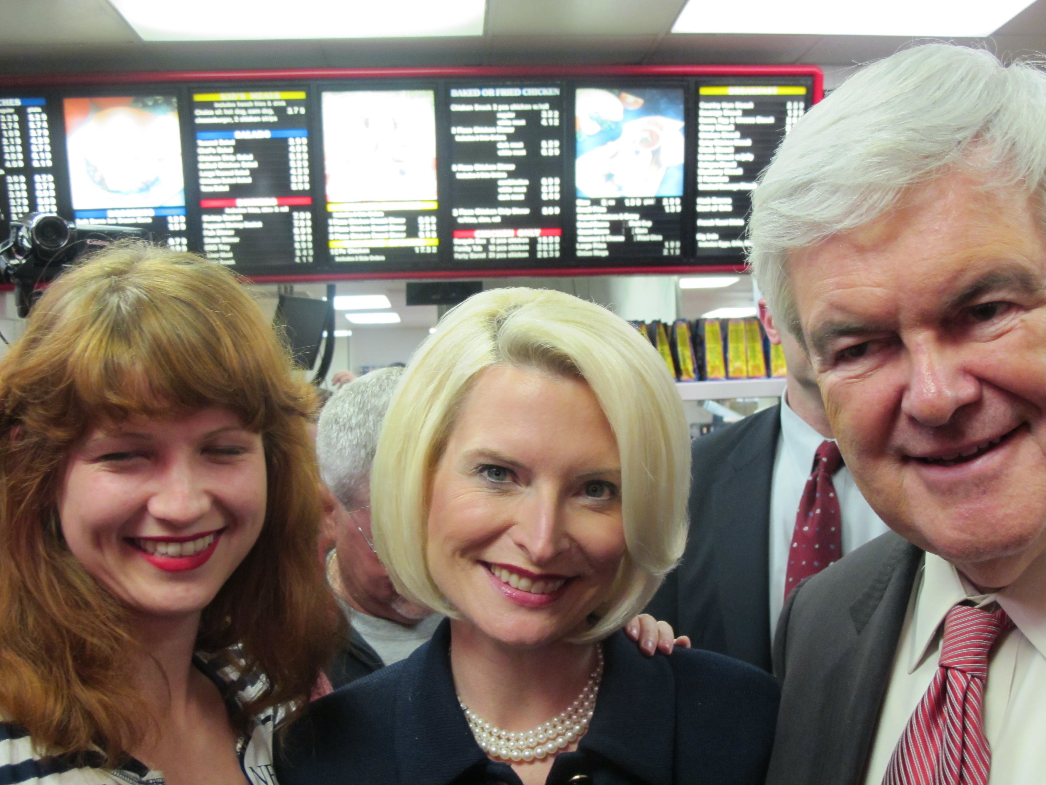 Meanwhile, Newtmentum himself was slowly plowing his way through the crowd. Sally and I got ourselves into position to grab a picture with the candidate. When our turn came, I rambled about how much I loved his “big ideas”, to which he sleepily grunted. As I lined up to take Sally’s photo with Callista, Callista noted that she also had a Canon G-10. They exchanged pleasantries about what a good camera it was, Sally choosing not to reveal that she had a G-11. No need to one-up Callista in fanciness.