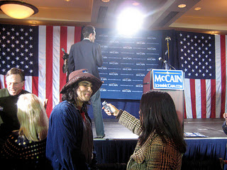 We expected some kind of security or line when we got there, but Johnny Mac had few die-hards in his camp. We waltzed right into the half-empty ballroom, where we drank whiskey and chatted up our “fellow” young Republicans. We were in the third row for his victory speech, and afterwards, were interviewed by the Canadian National Broadcasting Network. When asked “why young people were supporting John McCain”, my friend Pat, putting his improv training to good use, jumped in with, “John McCain embodies youth! He embodies vigor, and the future. What other candidate could young people possibly rally behind?”