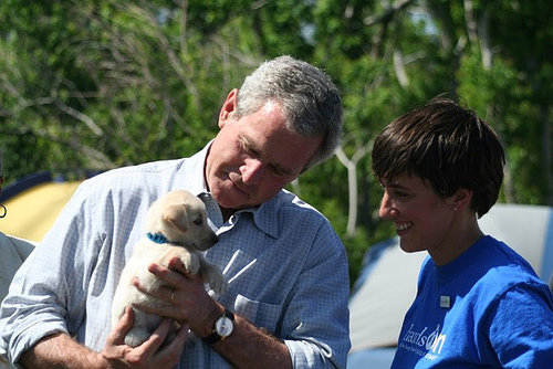 The ultimate compromise involved the creation of a large banner that said very explicitly: “Hands On Gulf Coast supports and loves AmeriCorps.” It was complete with a humungous AmeriCorps A painted in the middle, and it was hung prominently on the wall of the main dining area where we would meet Bush and his entourage. Even up to that day, it was unclear whether or not our AmeriCorps friends would be part of the process. In the end, the decision was that they would stand back away from the cameras, near the Animal Rescue pen where the puppies were kept, and Andrew and Caroline would manage the potential meet with the President as appropriate.
