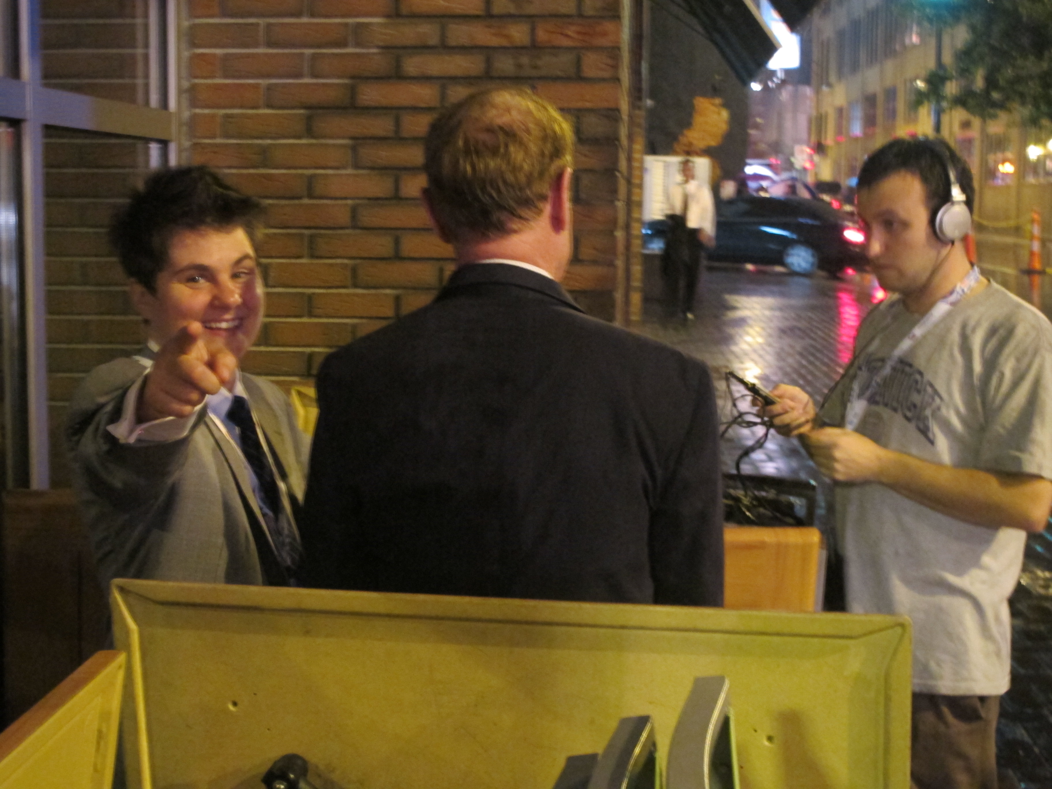 Interviewing GLBT leaders in the pouring rain, with Yetta Kurland.